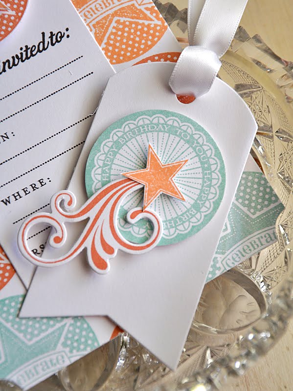 To complete this party ensemble I created an invitation by die cutting a base from white cardstock using one of the new Card Base-ics dies. Stamped the base with a second circular tag image in the same color combo.